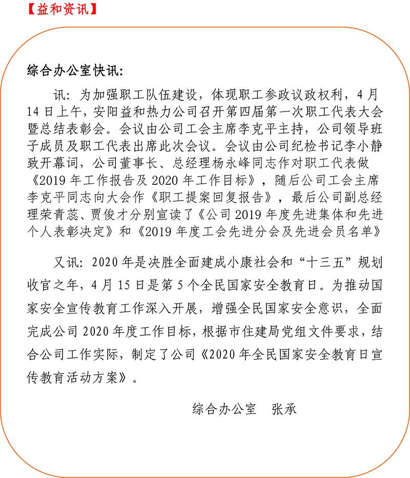 安陽益和熱力公司召開第四屆第一次職工代表大會(huì)暨2019年度總結(jié)表彰大會(huì)