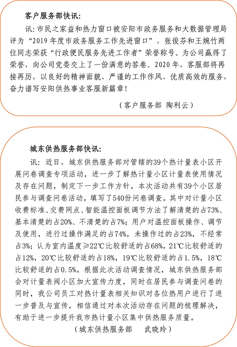 楊總在工作報(bào)告中指出,上一年通過公司全體干部職工的克難攻堅(jiān)、上下合力、團(tuán)結(jié)協(xié)作,全年各項(xiàng)經(jīng)濟(jì)效益指標(biāo)均達(dá)到預(yù)期目標(biāo)。2020年,我們要以習(xí)近平新時(shí)代中國特色社會(huì)主義思想為指導(dǎo),全面貫徹黨的十九大和十九屆二中、三中、四中全會(huì)精神,增強(qiáng)“四個(gè)意識(shí)”、堅(jiān)定“四個(gè)自信”、做到“兩個(gè)維護(hù)”,強(qiáng)力落實(shí)各級(jí)關(guān)于深化國有企業(yè)改革的政策要求,堅(jiān)決執(zhí)行市委市政府和市住建局黨組的決策部署,秉承“把以人民為中心作為一切工作的出發(fā)點(diǎn)、落腳點(diǎn)和方法論”的企業(yè)宗旨,堅(jiān)持“科技引領(lǐng)、規(guī)范管理、優(yōu)良管網(wǎng)、一流服務(wù)”的發(fā)展理念,嚴(yán)格“目標(biāo)明確、時(shí)限明確、責(zé)任明確、結(jié)果明確”的工作要求,堅(jiān)定地?fù)?dān)負(fù)起集中供熱建設(shè)發(fā)展的重大使命,擔(dān)負(fù)起實(shí)現(xiàn)國有資產(chǎn)保值增值的重大責(zé)任,堅(jiān)定地推進(jìn)創(chuàng)新變革、效率變革和質(zhì)量變革,做強(qiáng)做大做優(yōu)國有資本,務(wù)實(shí)創(chuàng)新、同心同德,為全市實(shí)現(xiàn)“一個(gè)重返、六個(gè)重大”貢獻(xiàn)益和力量。